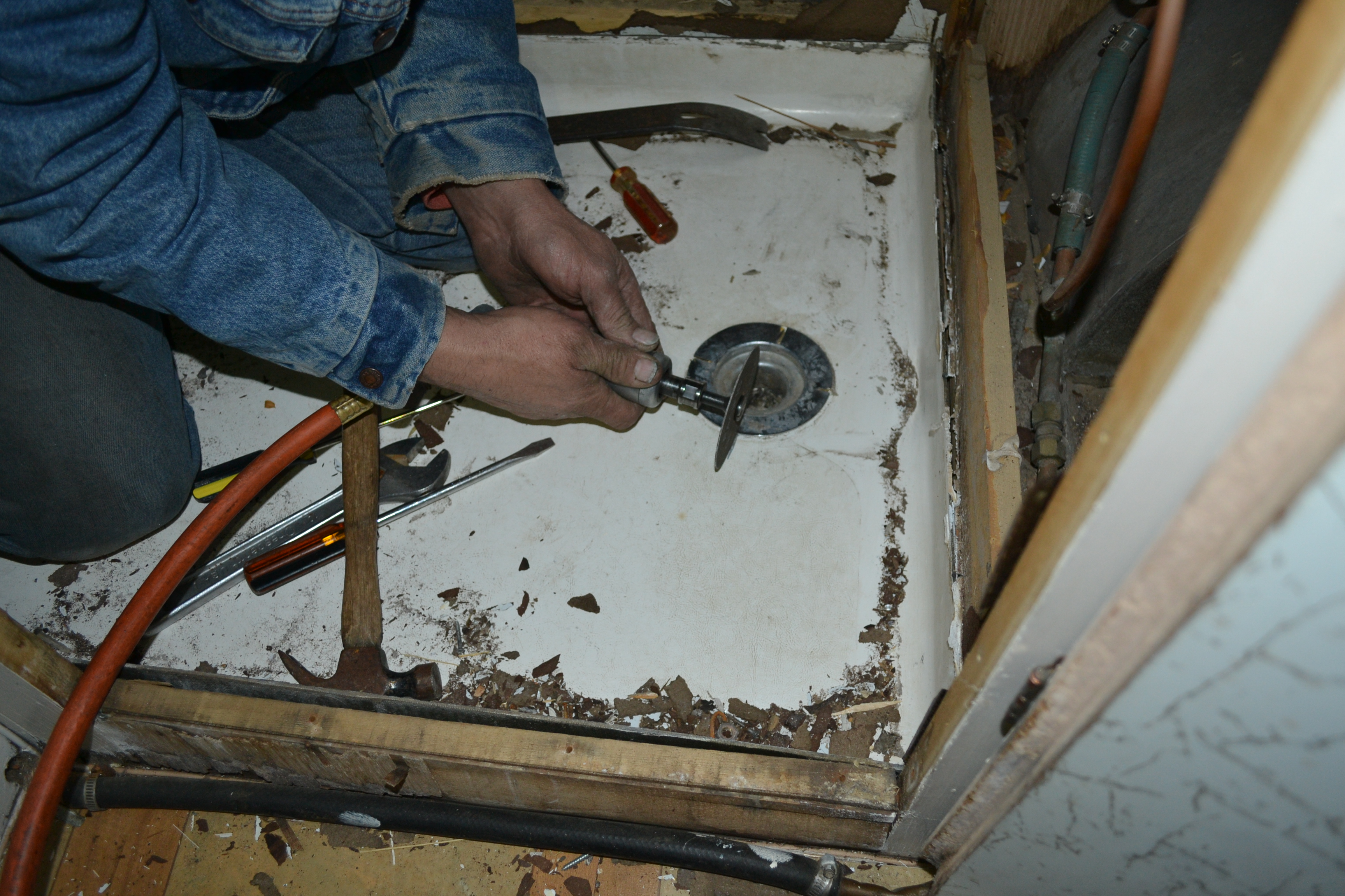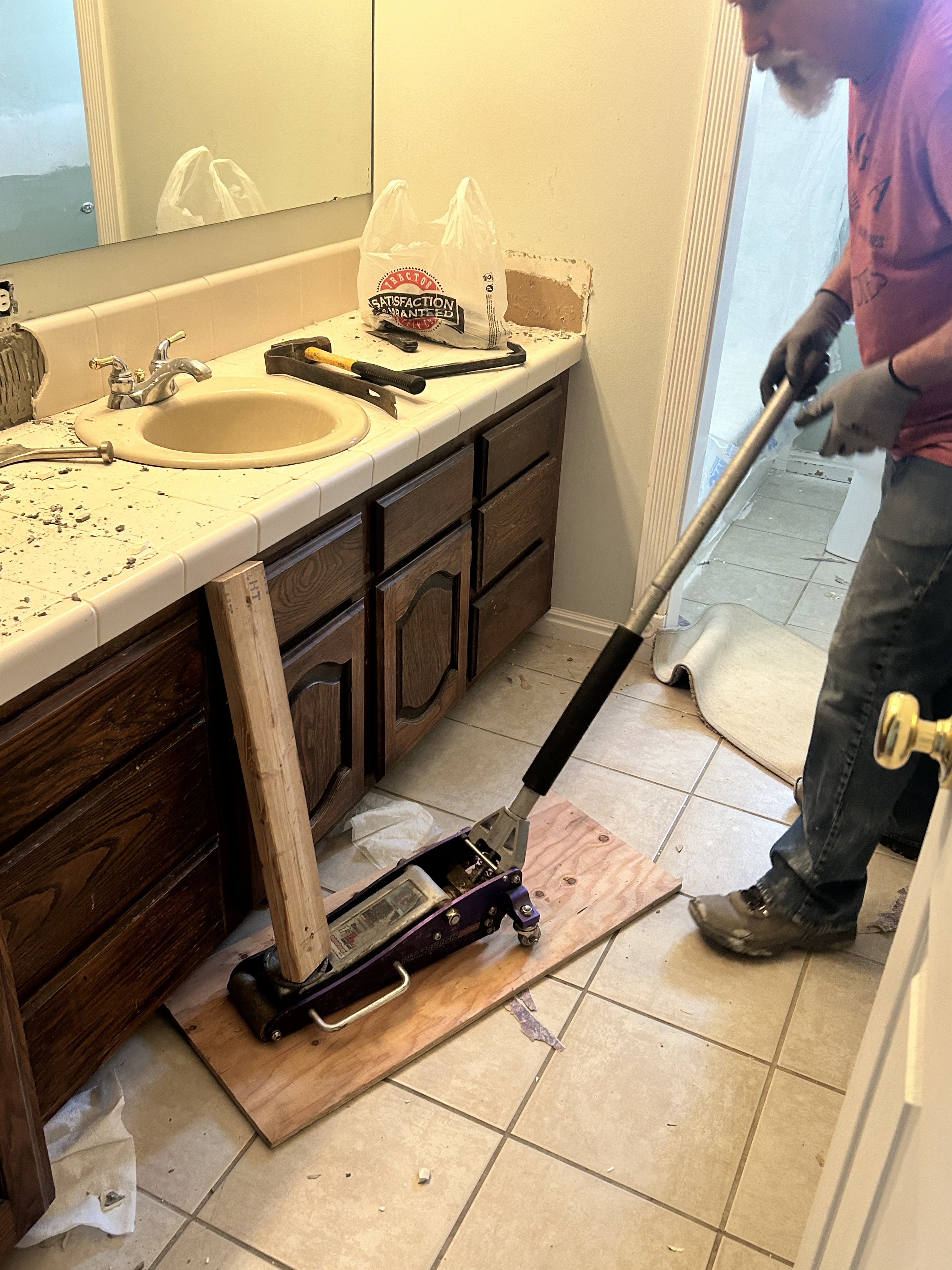This guy is so handy! He got the floor jack and some 2x4s and before long, that nasty tile was just a memory. Then he built a box, complete with fake drawer fronts to raise the height of the counter to a standard 36 inches! I was super excited about that – no more folding myself in half to spit out the toothpaste.