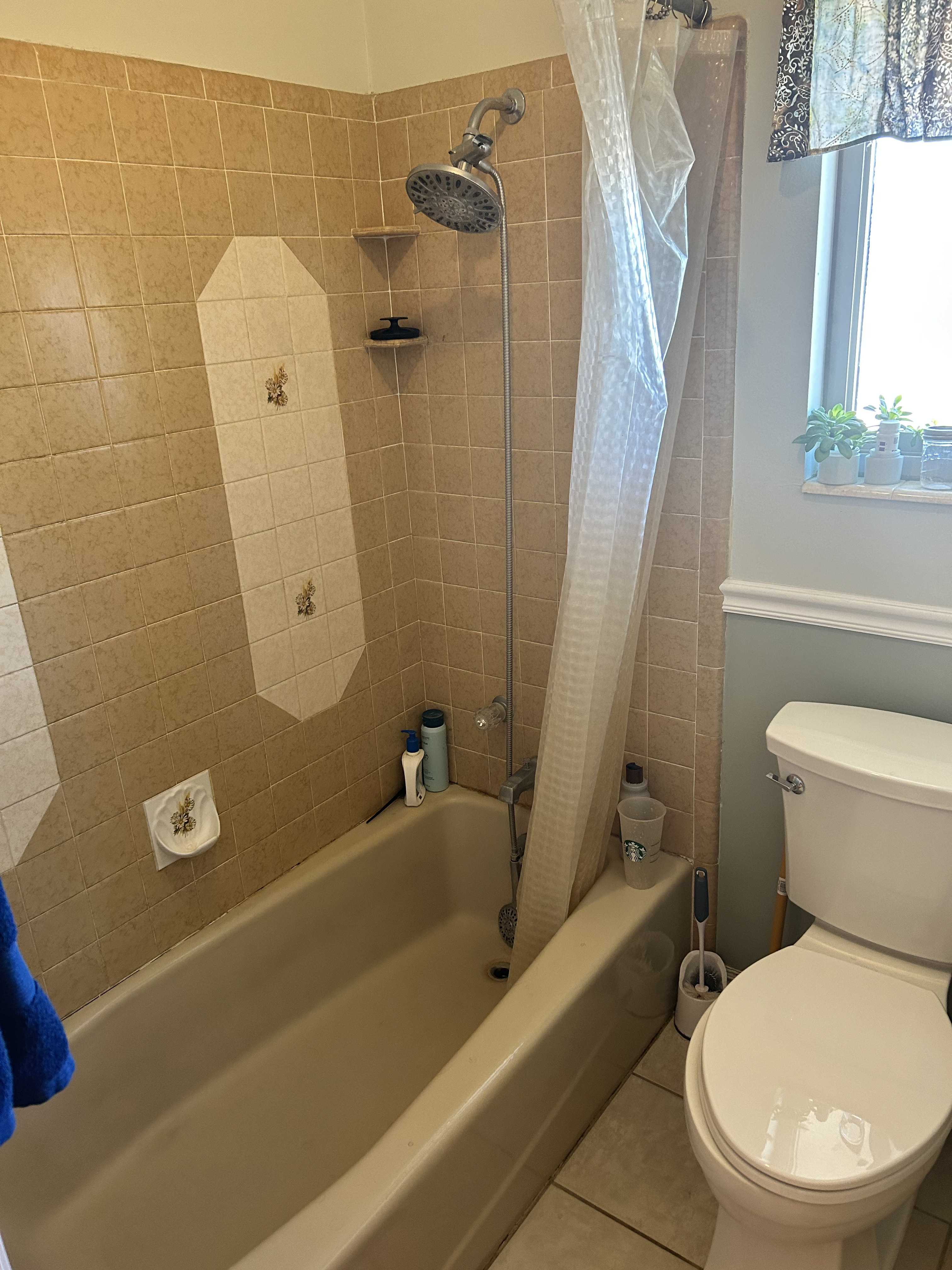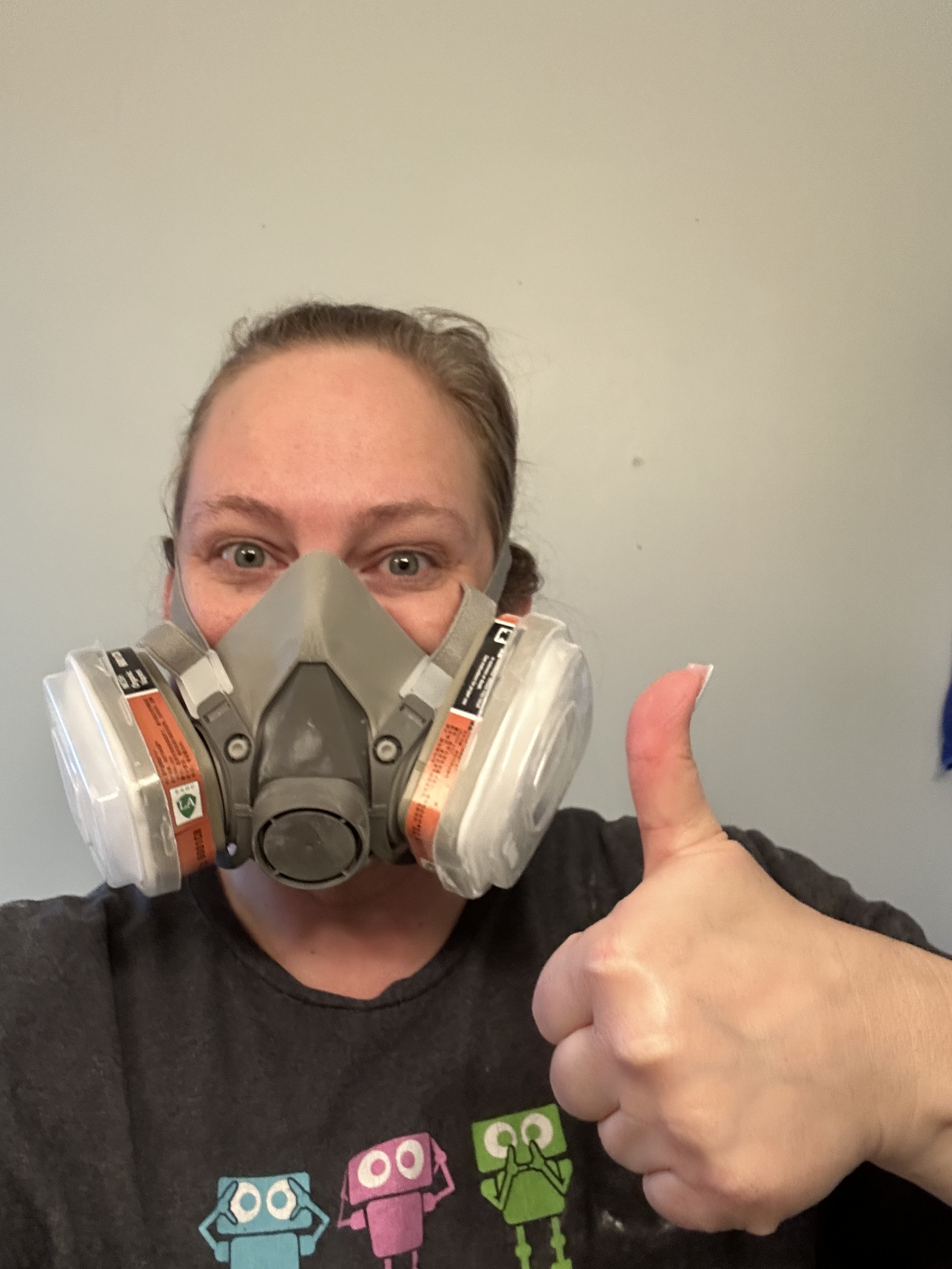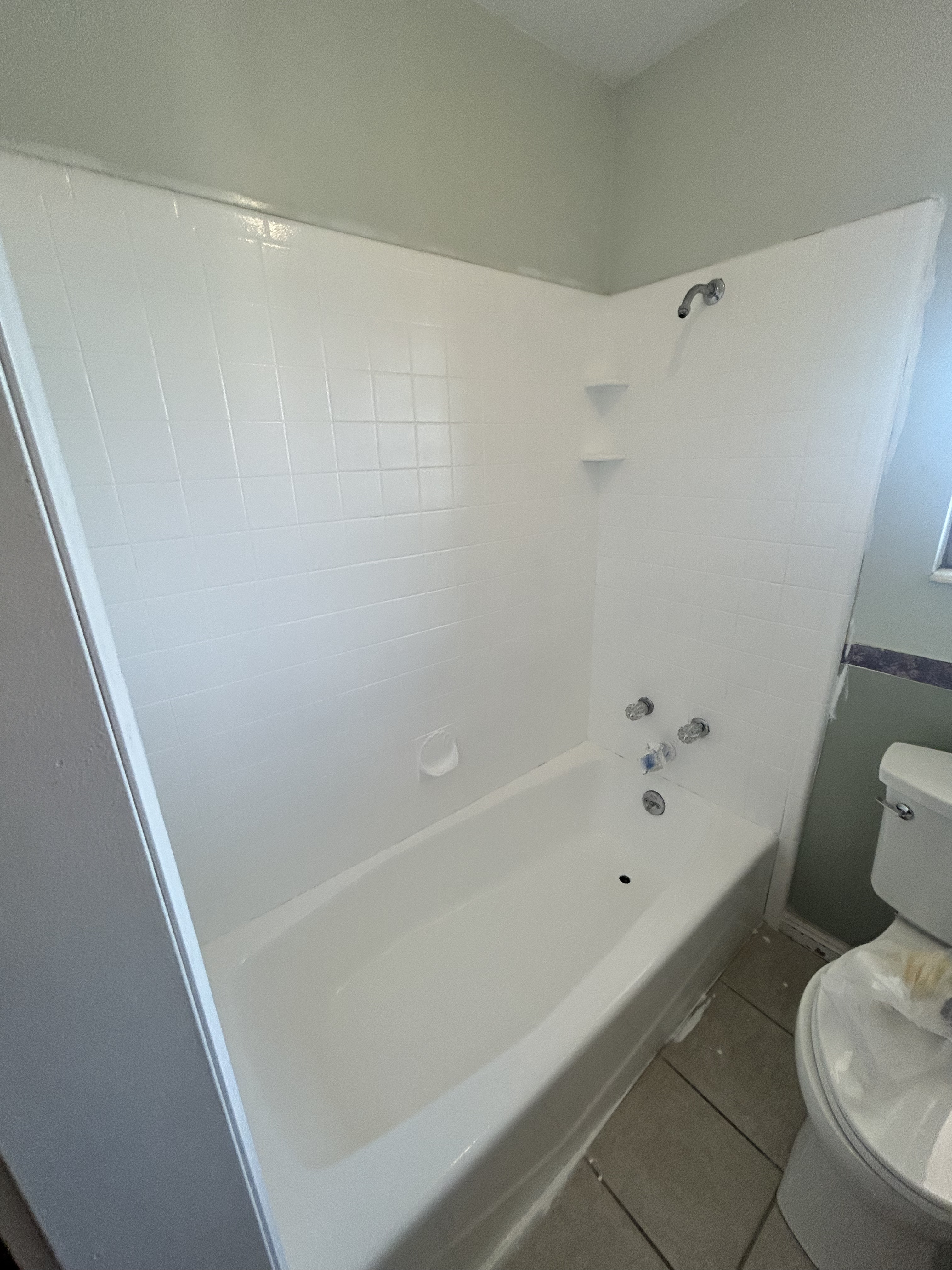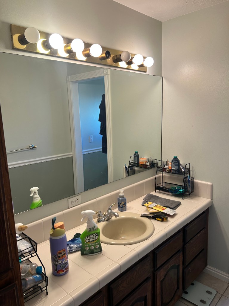The magic that made this all possible came in a little box from Amazon. Did you know you can PAINT your tub and tile? Well, you can if you use this Rust-Oleum Tub and Tile Refinishing Kit. It’s amazing! My bathroom took 2.5 cans, but even still that is a fraction of what it would cost to replace it. And since it was all in excellent condition (other than being an ugly color), I just channeled my inner Joanna Gaines and donned my dystopian gas mask, then proceeded to sand and spray (repeat that for a total of 3 coats). I might have been able to get away with 2 coats, but that third one was definitely worth it.