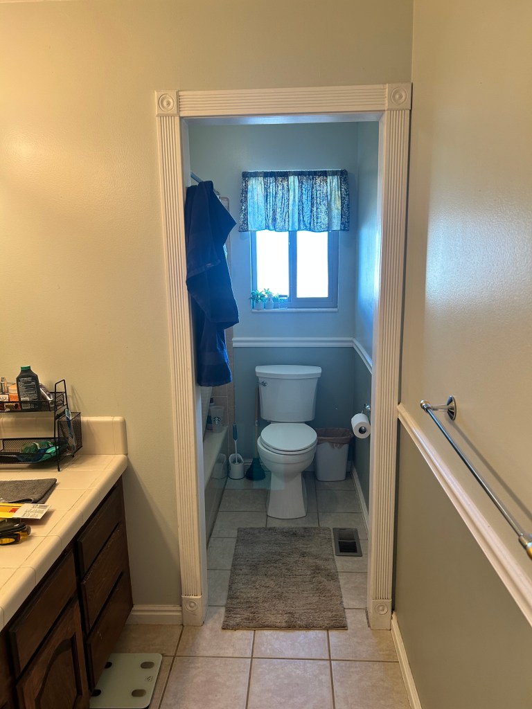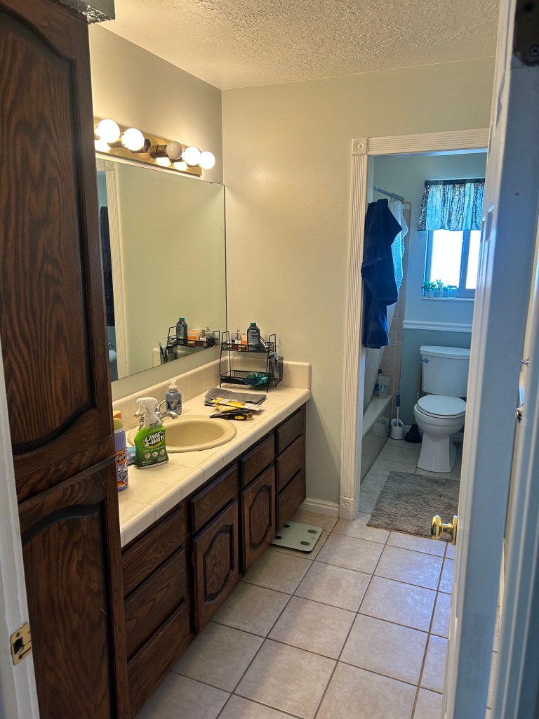 Sure, this ugly bathroom was functional… I mean, we could wash, brush and flush and, honestly, that’s what matters most. But the shower head was hanging limply at a weird, super-short height, and the nasty tile countertop was so low! It was only 30 inches from the floor, and while I’m sure that’s great for the vertically challenged, we are tall people around here!