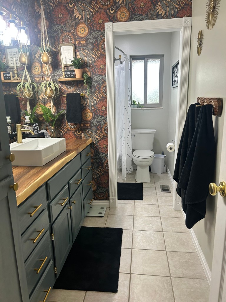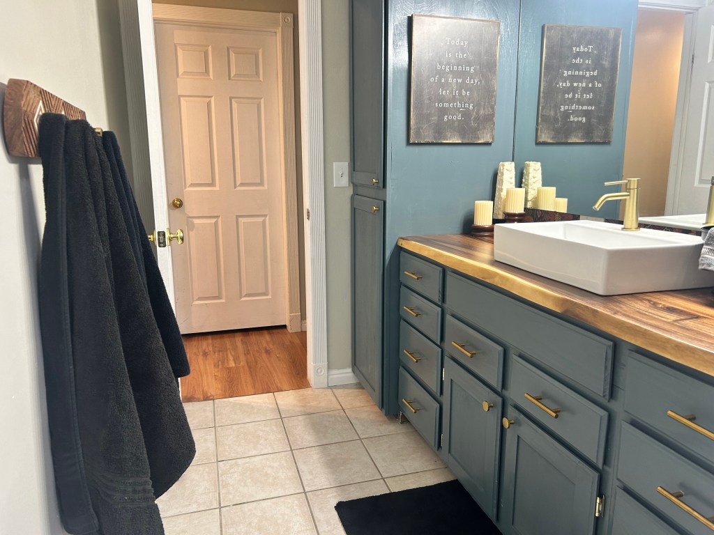 While he was busy in his workshop, I got busy painting. I went to Home Depot for a gallon of the wall color we’ve been using throughout this house. It’s Sherwin Williams Sedate Gray, and it’s perfect with all my earthy, moody colors. Luckily, that was the only paint I had to buy because I had a full quart of some mistinted cabinet paint from a previous project. Turns out, it was the perfect color for the vanity and linen cupboards!